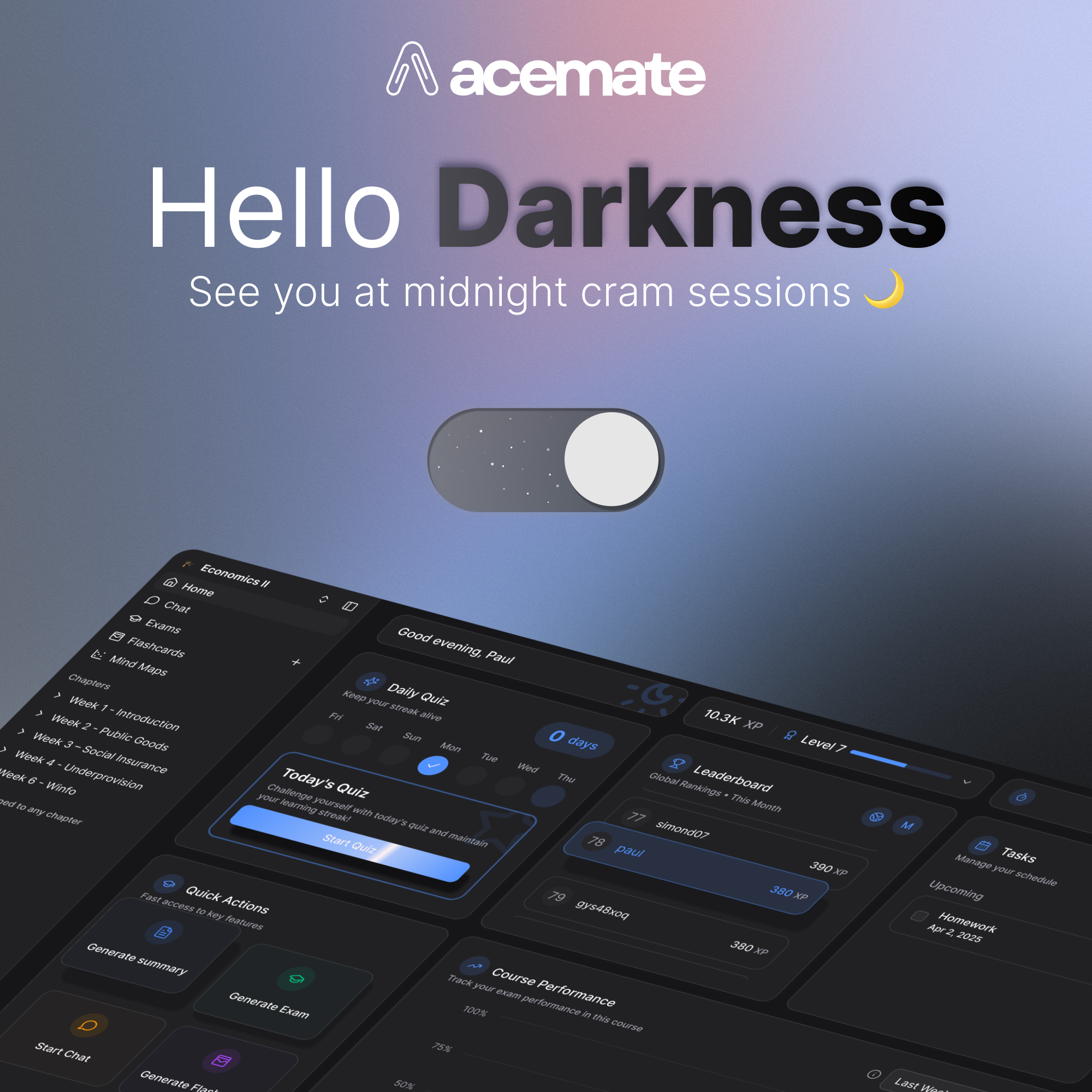 By popular demand, you can now switch to dark mode in acemate. Perfect for midnight cram sessions or just a sleeker vibe. Alongside, we launched a fresh design system for a smoother, more consistent experience.